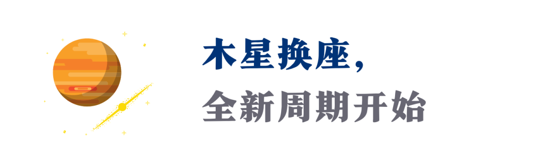 木星在一个星座的停留时间通常在一年左右,有时也被称作“岁星”。当木星经历跨座,意味着以年为单位的一个全新大周期的开启。