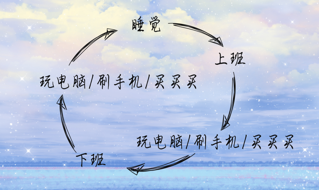 睡觉睡觉睡觉、工作工作工作、玩电脑/刷手机/买买买、睡觉睡觉睡觉、工作工作工作、玩电脑/刷手机/买买买……