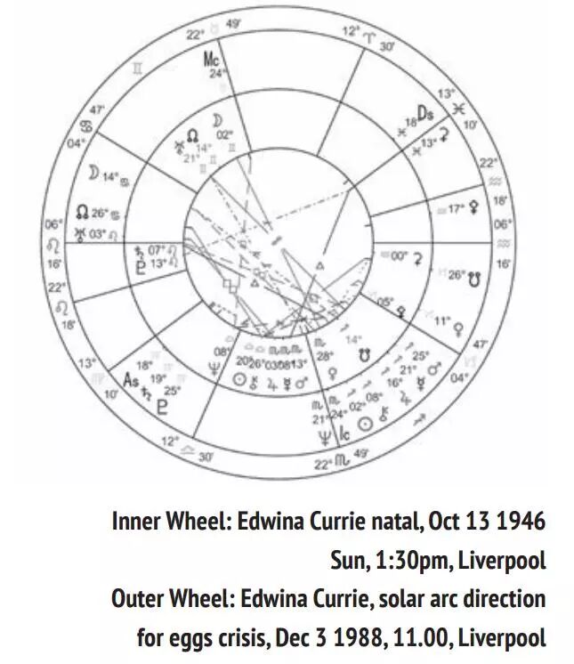 当她的太阳弧月亮到达巨蟹座中度时,她把脚丫放进嘴里,向大众宣传大多数鸡蛋都被沙门氏菌污染。这导致了鸡蛋销售的突然大幅下降,她不得不引咎辞职。
