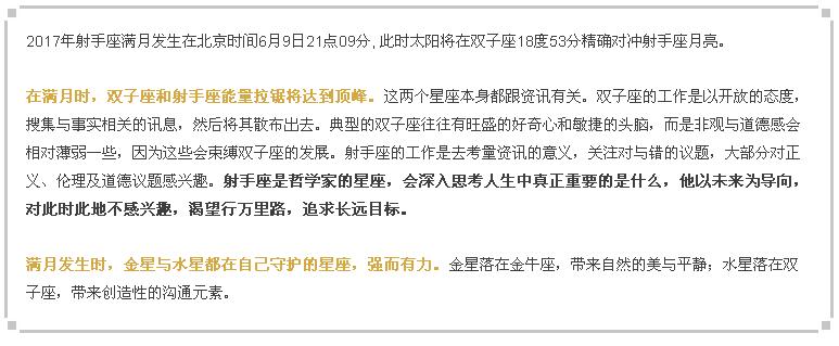 这是一个强调变动的满月。无论是双子座、射手座,还是双鱼座,作为变动星座都有很强的适应性。特别是满月所落的宫位,是我们需要怀着开放的心态去改变的领域。如果满月落入你的第七宫,则要从亲密关系着手改变;如果落入你的第四宫,可能要从你的原生家庭开始改变;如果落入你的第二宫,改变可能是始于提升你的自我价值。