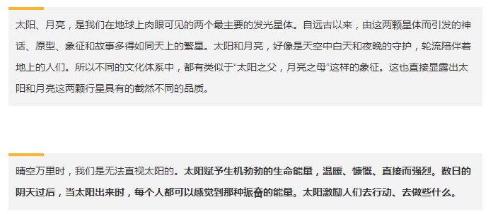 人体70%~80%都是由水分构成,所以在新月和满月的时候,人的体液也会对月亮做出反应。在占星学中,月亮与人的情绪、感觉相连接。与新月不同的是,满月时刻,太阳和月亮形成的潮汐力是相反的,所以带有极强的“两极张力”。想象一下战场上对峙的双方,在各自的阵地上望向对方,他们实力不相上下、气氛剑拔弩张,谁也不妥协与让步。由此带来的张力,就是满月时刻天空中星体间的能量。占星学是基于“如其在上,如其在下”(As above ,so below)的象征体系。所以在满月的时候,无论你感受到什么能量,这种能量都会被放大。因为这个时候,整个地球的能量都被牵引向月亮。古代的印度瑜伽士会特别利用这一天帮助修行,因为满月日代表一种“提升”的可能性。