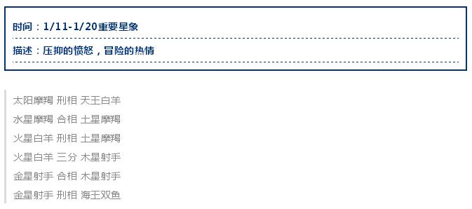 新月发生在摩羯座,同时太阳也将在摩羯座与冥王星合相,冥王星将让太阳以更强大却又隐蔽的方式来展现自己在世俗领域(摩羯座)的野心,当然六分的海王星让我们带着浪漫的梦想,同时木星将海王的梦想放大。